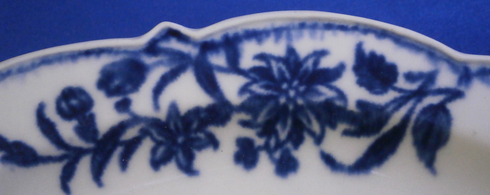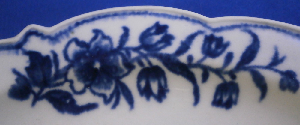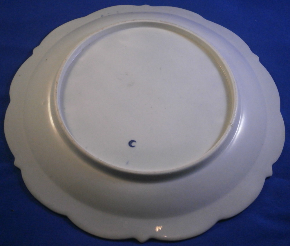 This is a dish that would have been an under plate for the strawberry / cress strainer dish I also have on the site. It was made by Worcester around 1770. The plate is decorated with a blue and white pattern called the pine cone pattern with a nice rim shape that has a blue line going along it plus five floral arrangements along the rim. The center has a large design including what looks to be pine cones and some flowers and leaves. The piece is in great condition with just some use marks to the clear glaze from where the straier would sit sort of like stacking wear. Only shows when held at the right angle to a light source. It is marked underneath with the under glaze blue crescent mark as shown. The piece is 0.875 inches tall and 8.25 inches in diameter. Please email me for more information or other pictures.