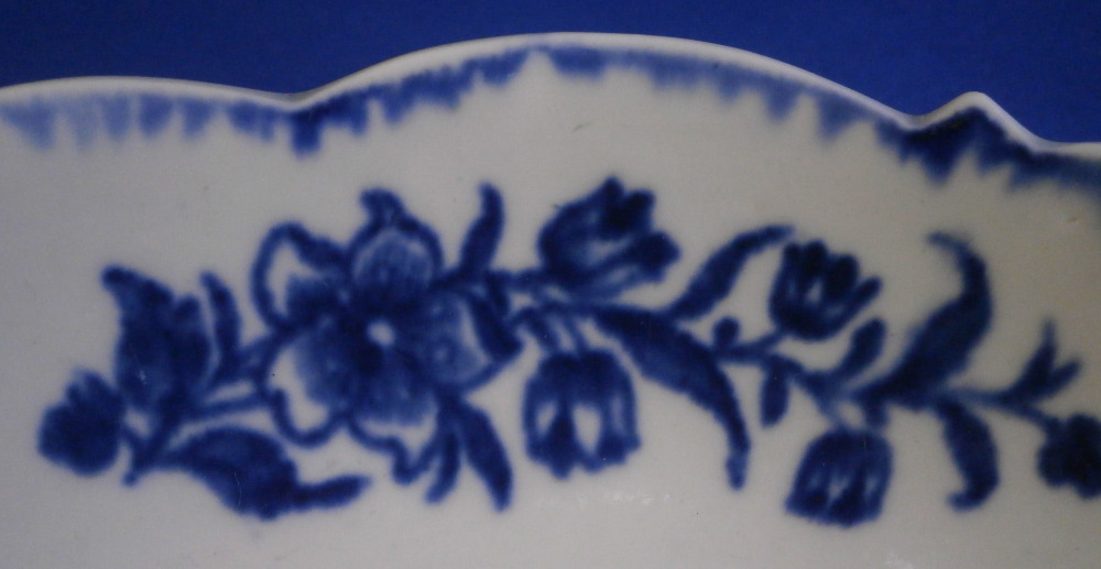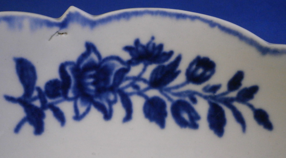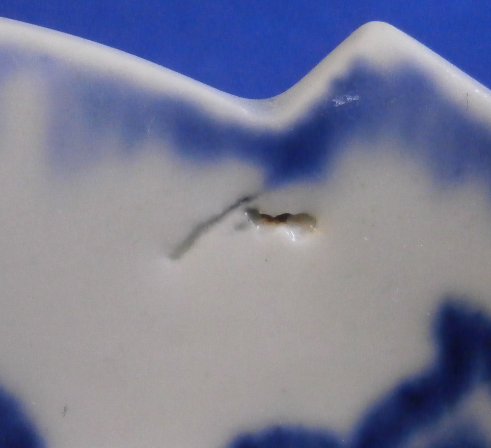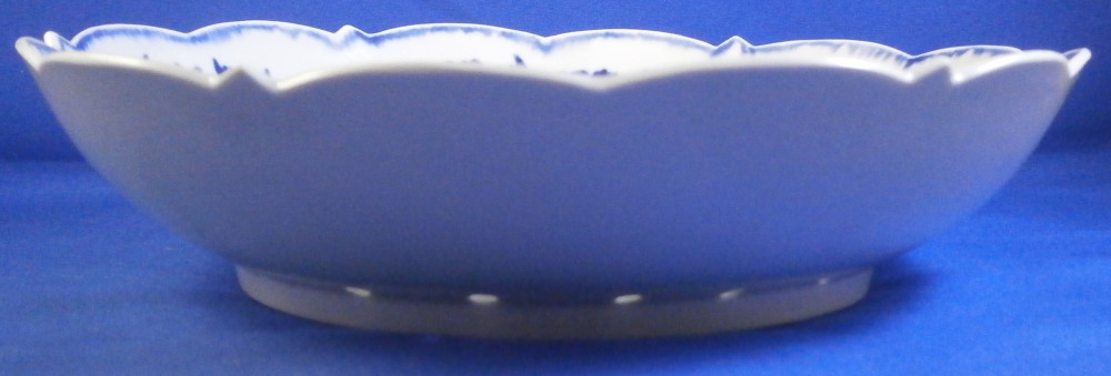 This is a strainer dish / bowl that would have been used for strawberry / cress made by Worcester around 1770. I also ahve the under plate for this dish up on the site. The strainer is decorated with a blue and white pattern called the pine cone pattern with a nice rim shape that has a blue line going along it plus five floral arrangements along the rim. The center has a large design including what looks to be pine cones and some flowers and leaves. The piece is in great condition with a manufacturing flaw / paste impurity that burned away fduring the firing process as shown. The piece is marked underneath with the under glaze blue crescent mark as shown. It is 1.875 inches tall and 7.75 inches in diameter. Please email me for more information or other pictures.