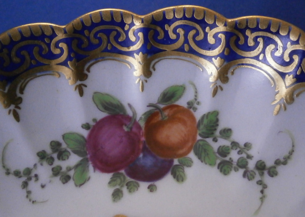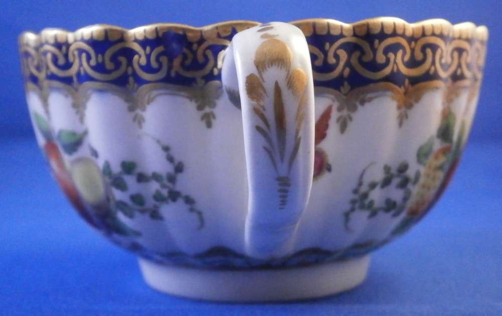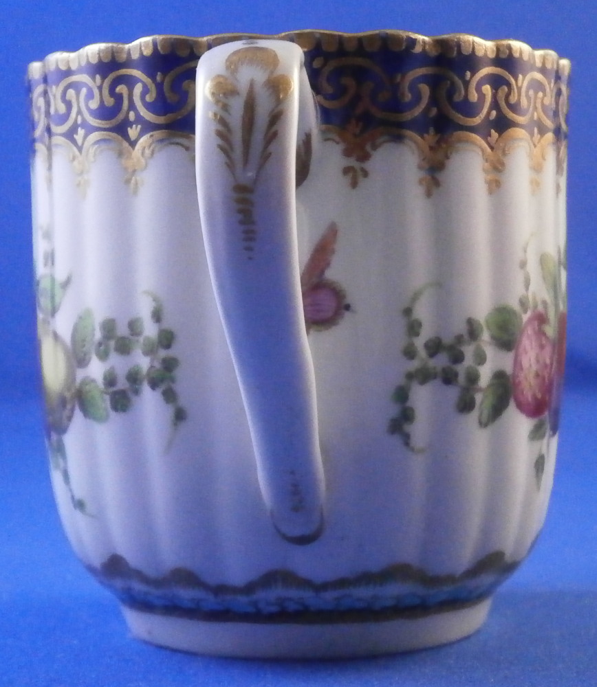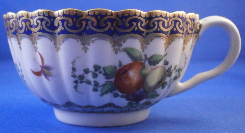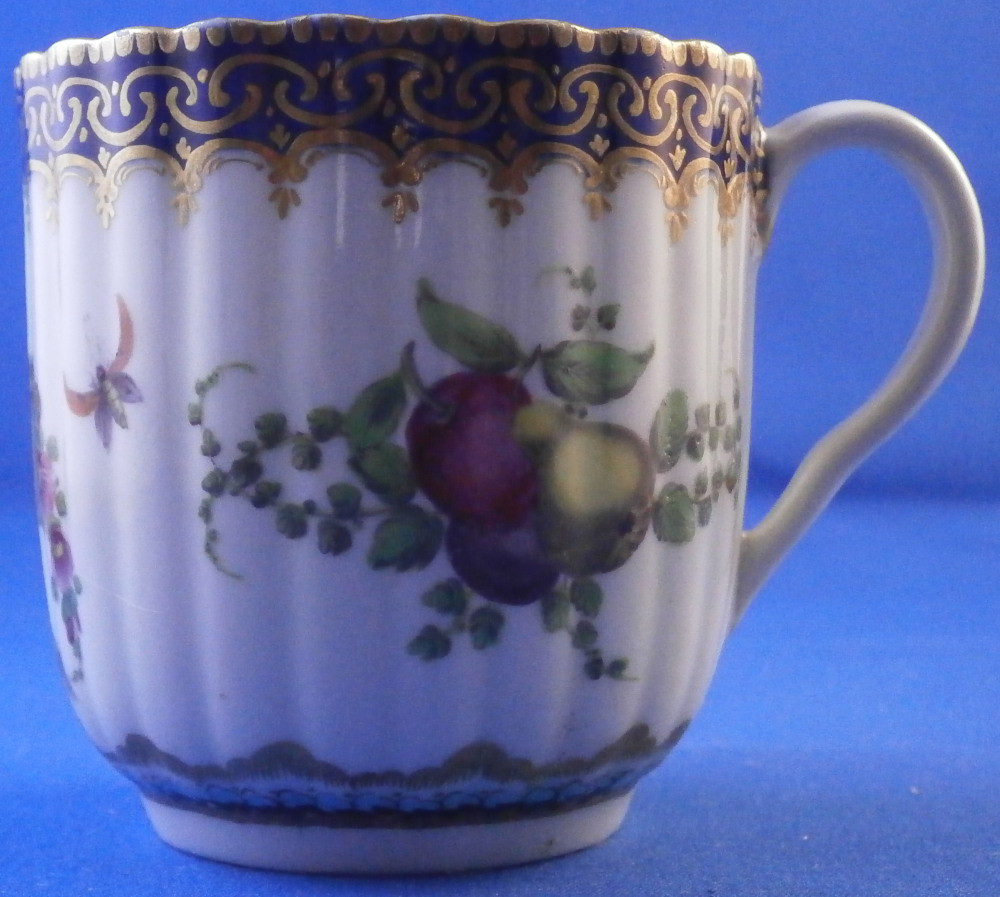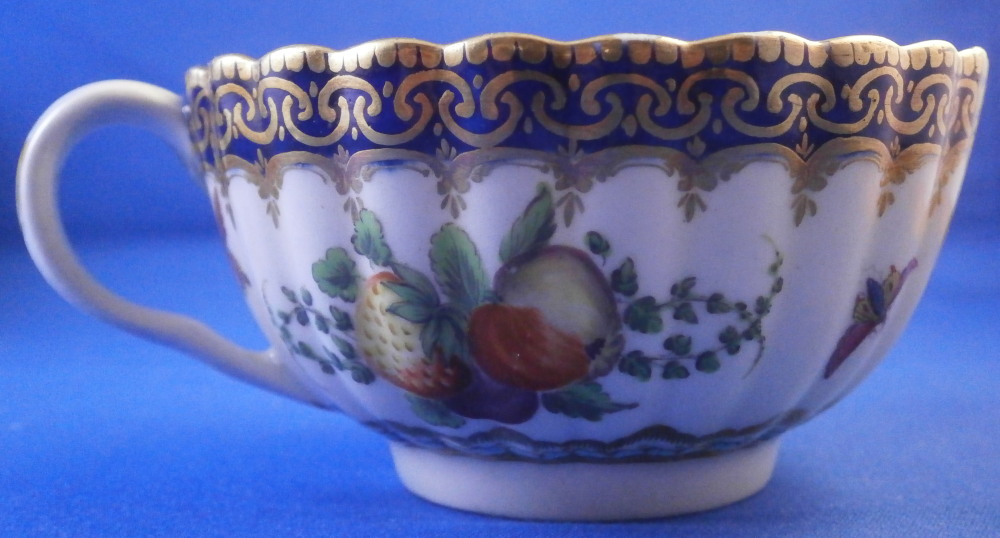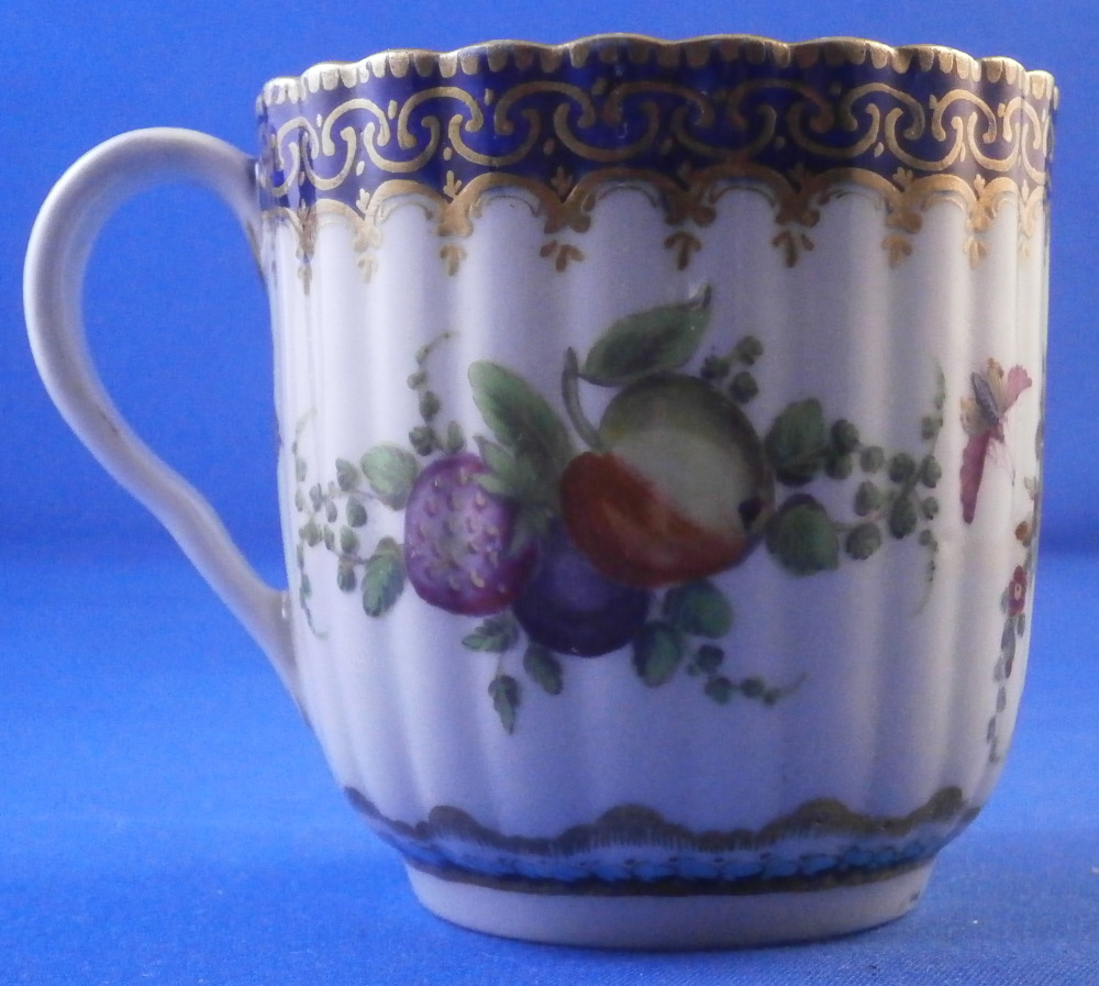 This is a very hard to find trio made by Worcester in the 18th century. All three peices are hand painted with a design very similar to the service made for the Earl of Dalhousie Lord Henry Thynne . Exactly the same except isntead of the scene in the center here we have an urn with flowers. All three pieces have a fluted shape to them, have some superb fruit arrangements as well as bugs painted on them and the superb cobalt blue ground color with a ncie gold trim on top. The center of the saucer, inside of the tea cup ad front of the coffee cup have the urn with flowers coming out of it with the tea cup and saucer having that neat turquoise trim around the scene. To find a trio in this pattern is almost unheard of and it looks amazing!! The quality of the painting is top notch! Both cups and the saucer are in great condition with a paint flaw to a spot of the brown design under the urn of the saucer, a touch of minor gold wear to the top edges only and wear to a raised spot of one of the fruit designs of the saucer from stacking / use. They display perfectly and look amazing! The tea cup is 1.75 inches tall and has a diameter of 3.375 inches. The saucer is about 1 inch tall and has a diameter of 5.5 inches. And the coffee cup is just over 2.5 inches tall with a diameter of 2.5 inches. Each piece is marked with their half moon mark underneath in under glaze blue as shown. Old clear tape residue left on the udnerside from a previous collector which ahs yellowed from age. Please email me for more information or other pictures.