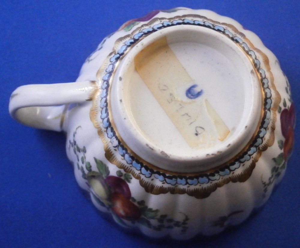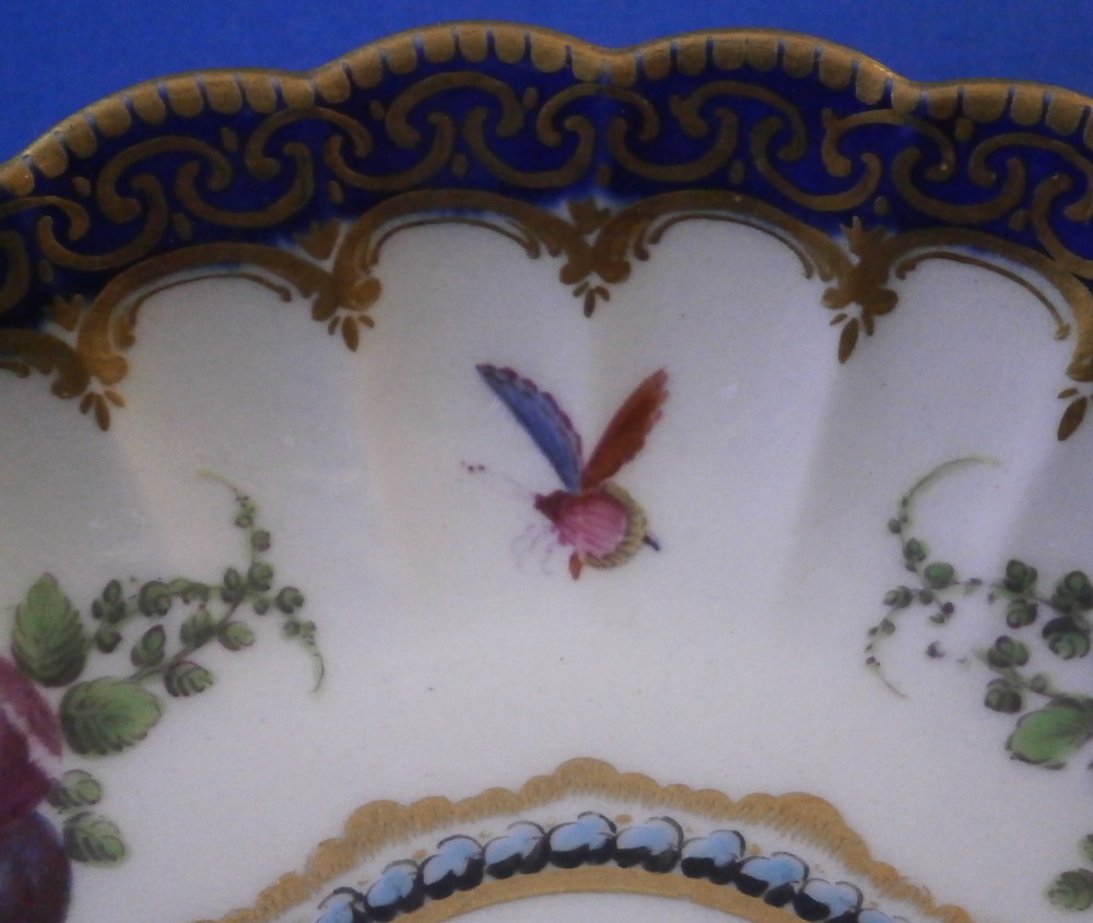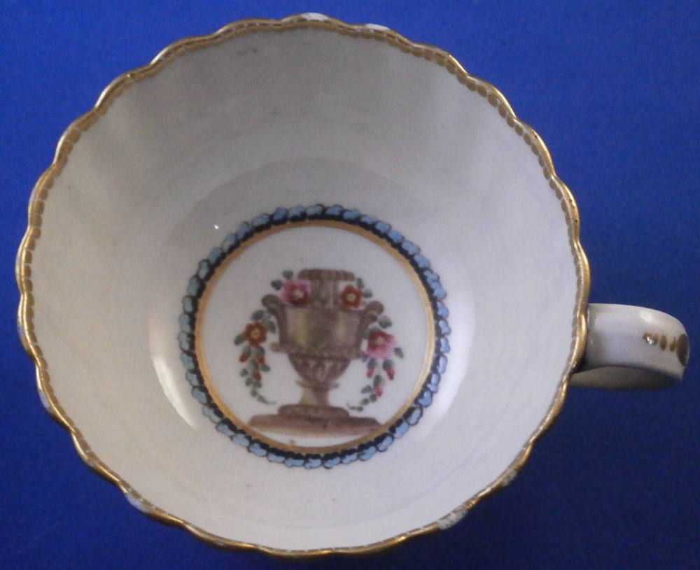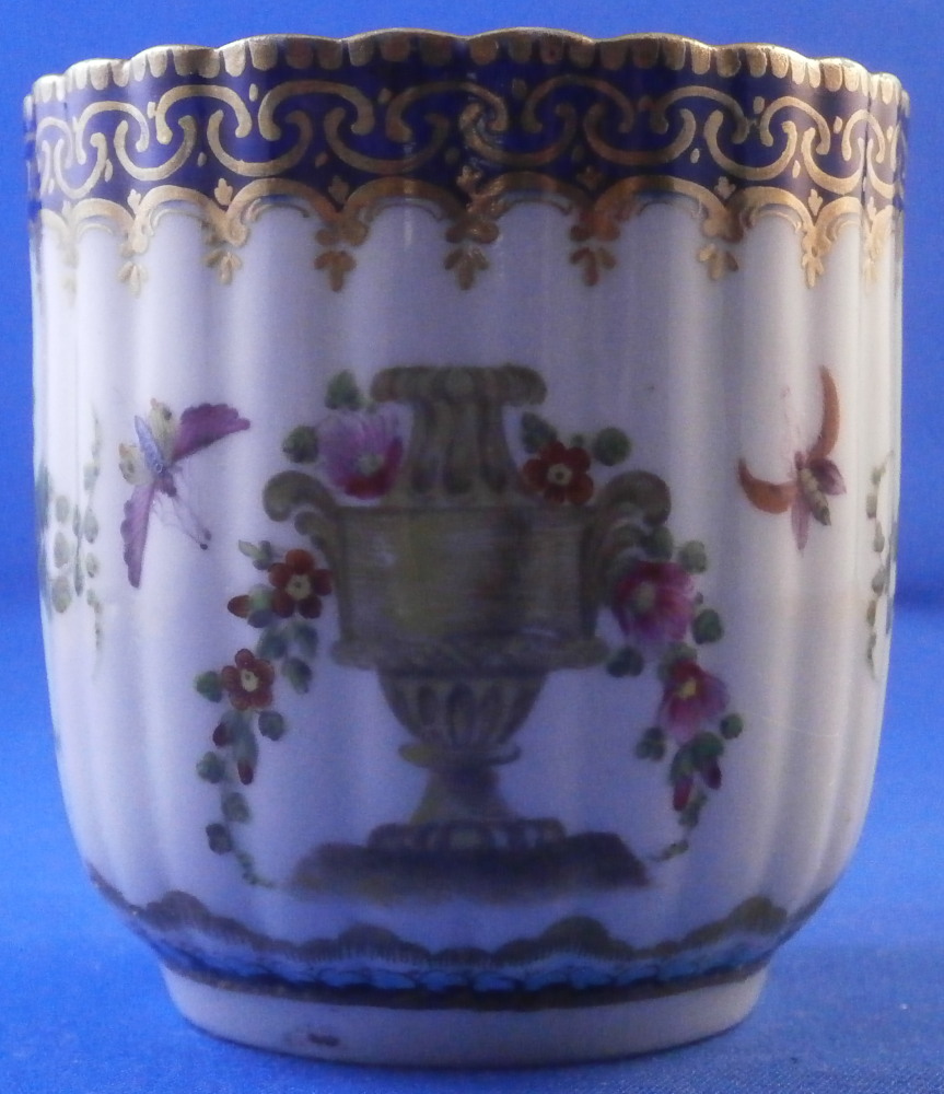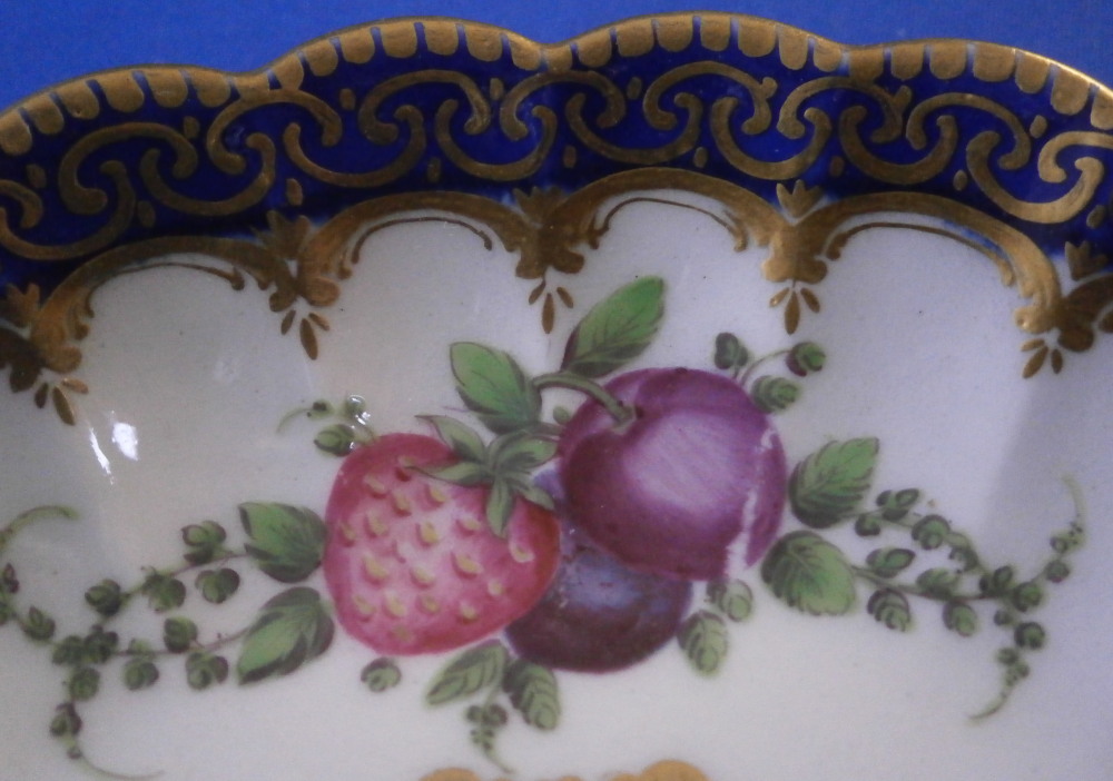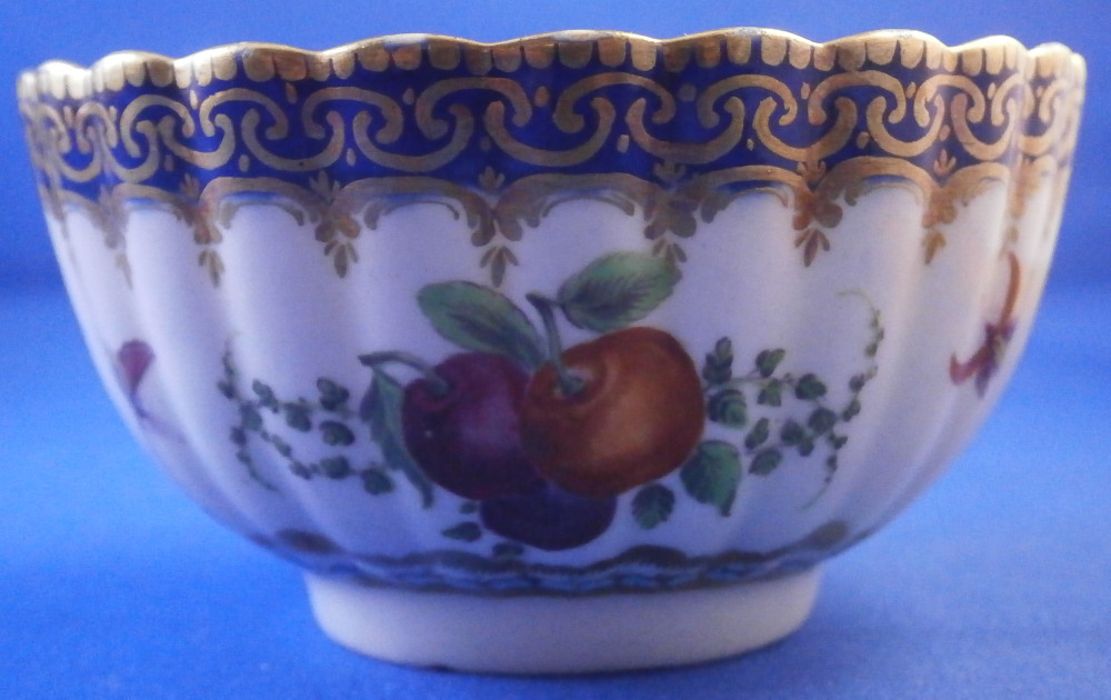 This is a very hard to find trio made by Worcester in the 18th century. All three peices are hand painted with a design very similar to the service made for the Earl of Dalhousie Lord Henry Thynne . Exactly the same except isntead of the scene in the center here we have an urn with flowers. All three pieces have a fluted shape to them, have some superb fruit arrangements as well as bugs painted on them and the superb cobalt blue ground color with a ncie gold trim on top. The center of the saucer, inside of the tea cup ad front of the coffee cup have the urn with flowers coming out of it with the tea cup and saucer having that neat turquoise trim around the scene. To find a trio in this pattern is almost unheard of and it looks amazing!! The quality of the painting is top notch! Both cups and the saucer are in great condition with a paint flaw to a spot of the brown design under the urn of the saucer, a touch of minor gold wear to the top edges only and wear to a raised spot of one of the fruit designs of the saucer from stacking / use. They display perfectly and look amazing! The tea cup is 1.75 inches tall and has a diameter of 3.375 inches. The saucer is about 1 inch tall and has a diameter of 5.5 inches. And the coffee cup is just over 2.5 inches tall with a diameter of 2.5 inches. Each piece is marked with their half moon mark underneath in under glaze blue as shown. Old clear tape residue left on the udnerside from a previous collector which ahs yellowed from age. Please email me for more information or other pictures.