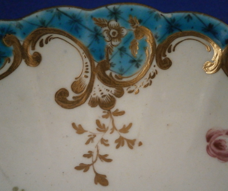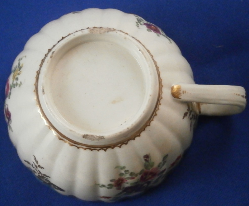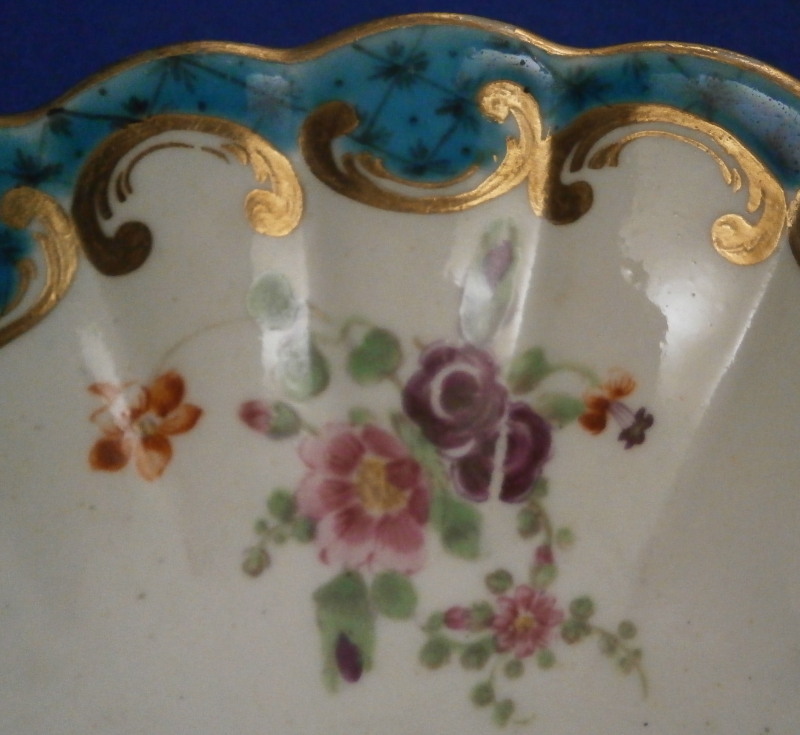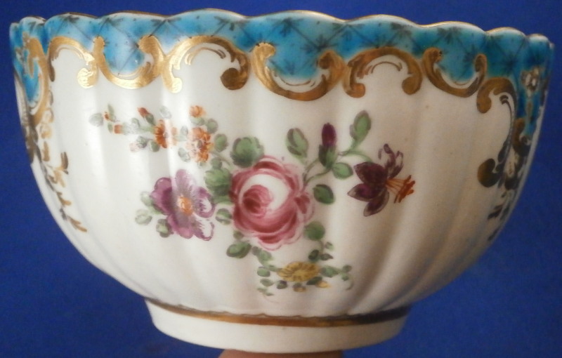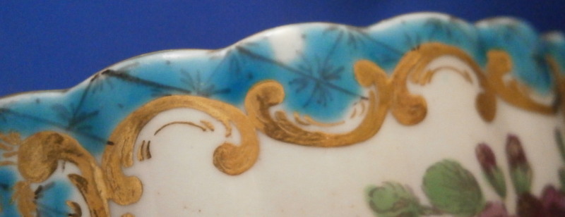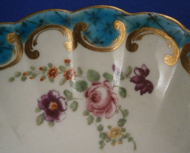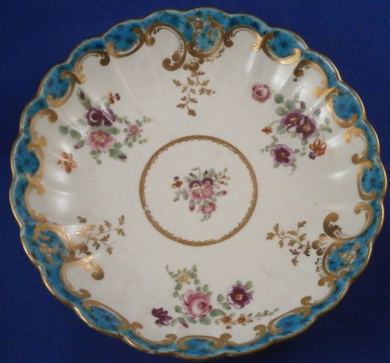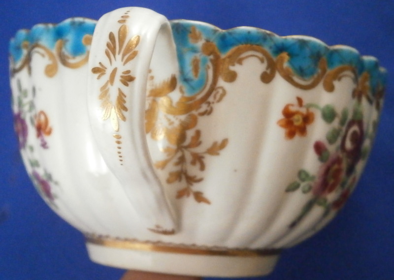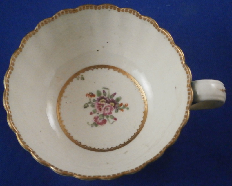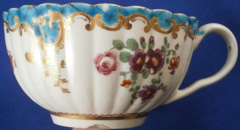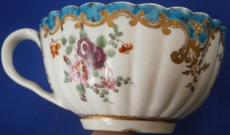 This is a nice cup and saucer made by Worcester around 1770. The set has a nice shape to it and is hand painted with some nice small polychrome floral arrangments but my favorite part is that turquoise and fancy gold trim along the rim. This color and even this trim is often associated with the workshop of James Giles but I do not know enough to be sure of that. Either way a stunning cup and saucer that are both in great condition. Some firing specs and a little wear to the high points of the flowers on the saucer and two chips to the foot of the cup as shown. The white spot on the turquoise trim is not a chip just where the color missed a spot. The cup is 1.75 inches tall and has a diameter of 3.25 inches. The saucer is 1.125 inches tall and has a diameter of 5.375 inches. Each piece is marked with their underglaze blue fret mark as shown. Please email me for more information or other pictures.