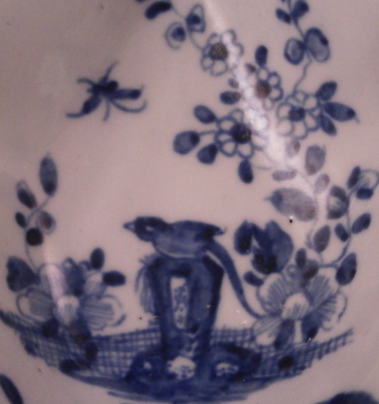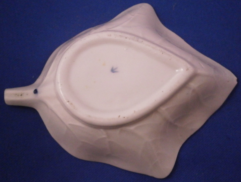 This is a rare pickle dish made by Worcester in about 1760 during their first period. The dish is thinly potted in soft paste porcelain and has an ivy leaf shape to it with teh stem forming a little handle and is decorated in under glaze blue with their Two Peony Rock Bird pattern. The bird is sitting on a rock in the center with the flowers to the sides and a little insect flying above. Nice decoration to the edges as well. This one here is a really nice example with the design looking nicer than usual. The underside is molded with the veins and stalk just like a real leaf - very elegant! It was meant to be used for pickles or sweetmeats at the table back in the day. The piece is marked with a workman's mark as shown. The little dish is in great condition with a tiny chip to the very tip as shown and a stray blue mark to the underside neat the handle but it displays perfectly! It is about 1 inch tall, 3.125 inches wide and 4 inches long. Please email me for more information or other pictures.