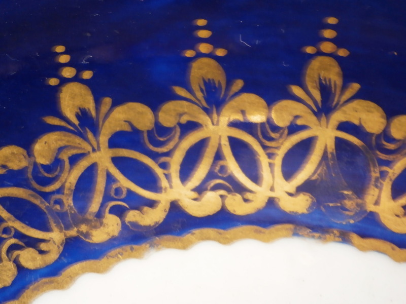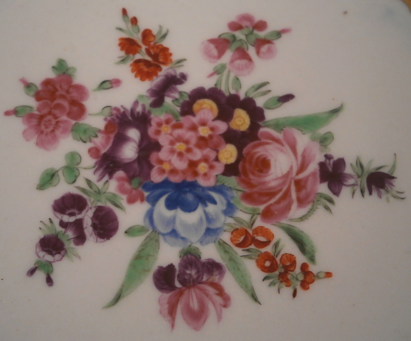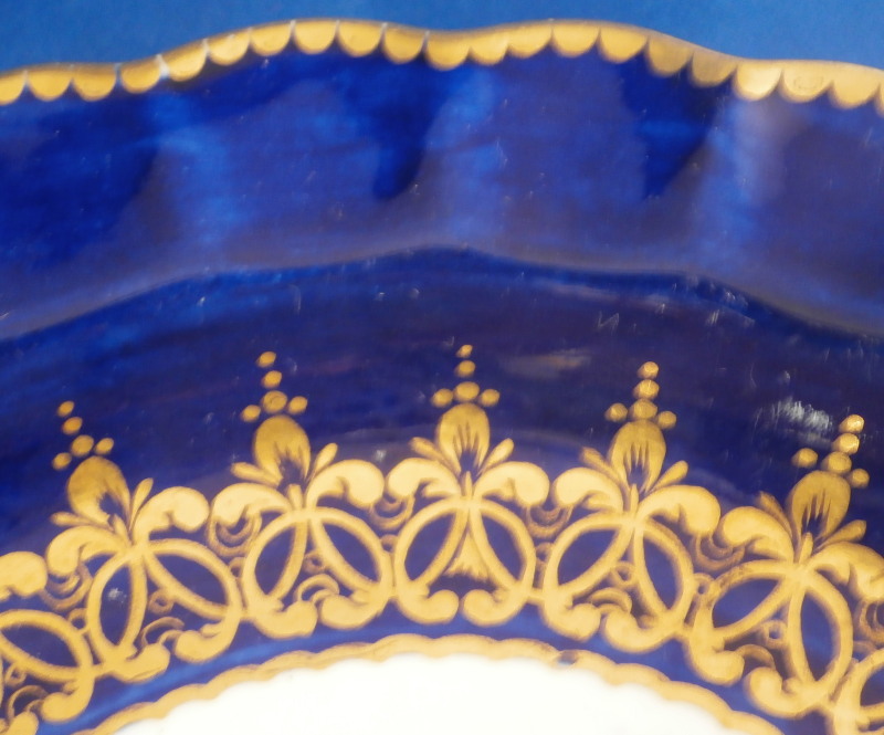 This is a plate made by Worcester around 1770. It is hand painted with a nice polychrome floral arrangement in the center, a cobalt blue ground colored rim with and amazing gold trim around the center well and a simple trim around the edge. The porcelain is of very good quality and a superb example of Worcester porcelain of the 18th century. The plate is in great condition with a little bit of wear to the gilding but it displays wonderfully. The plate is marked with the under glaze blue fret mark underneath meant to imitate the Chinese marks. It is is 1.125 inches tall and 7.875 inches in diameter. Please email me for more information or other pictures.