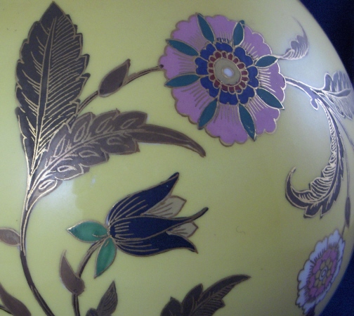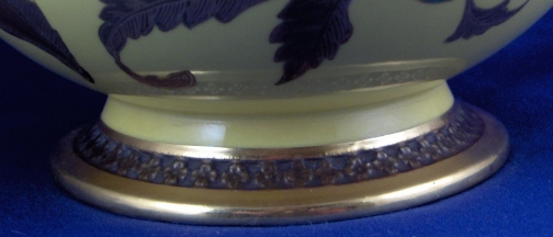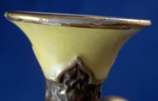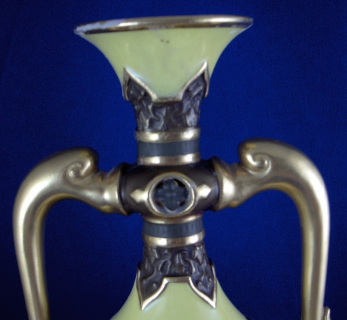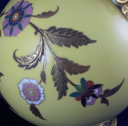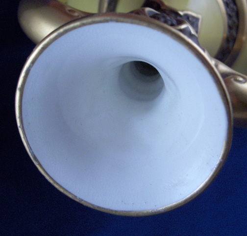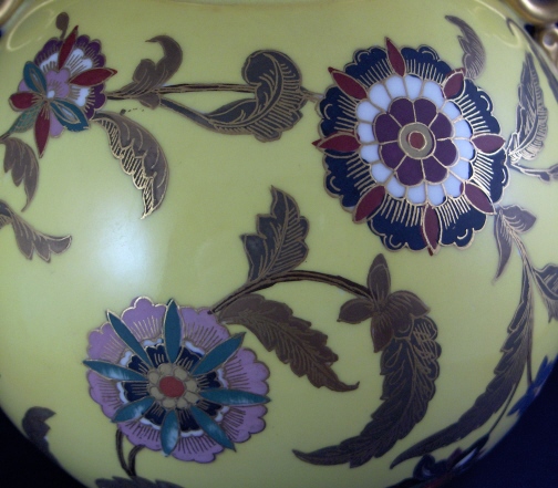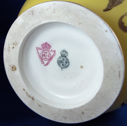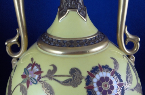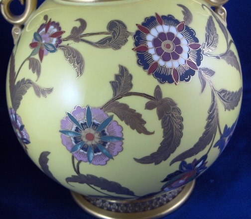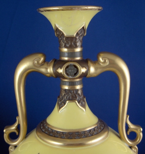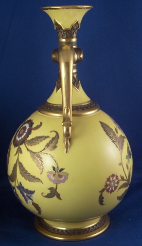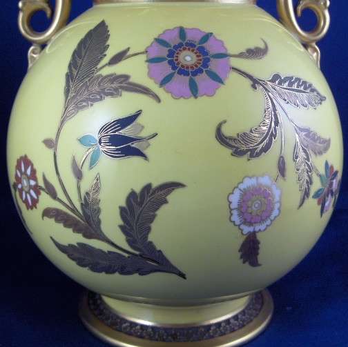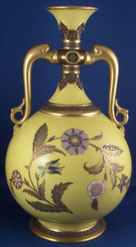 This is a about as nice a vase as one could wish for from the aesthetic period made by Worcester in 1883. Superbly modeled with two dolphin handles and some nice detailed brown and gold trim. Great strong yellow ground color that is handpainted with some really nice stylized flowers typical of this period. The vase is in perfect condition with the tiniest of wear mainly to the very top rim. It is 10.75 inches tall and has a diameter of about 6 inches. The piece is marked with the green Worcester mark with the year code U (I think), the impressed numbers 871 and U3, a painter's mark R in gold and a puce retailers type mark that stated made for Caldwell Philadelphia. Really a superb specimen for this period! Please email me for more information or other pictures.