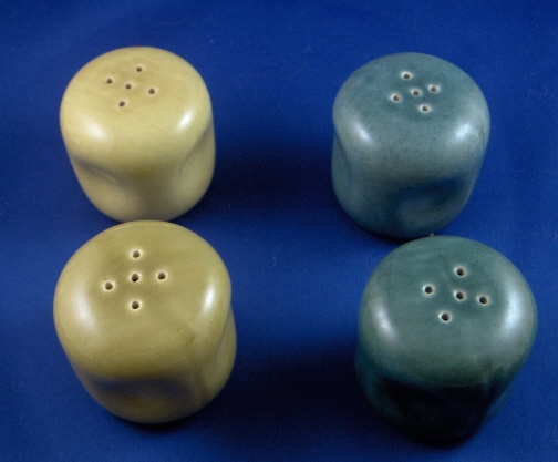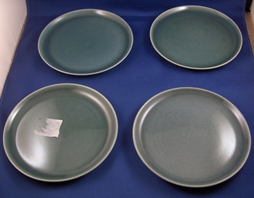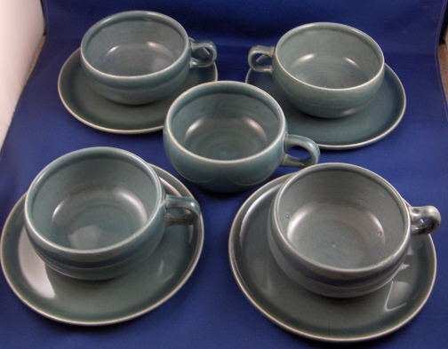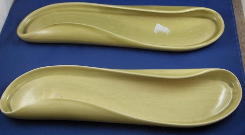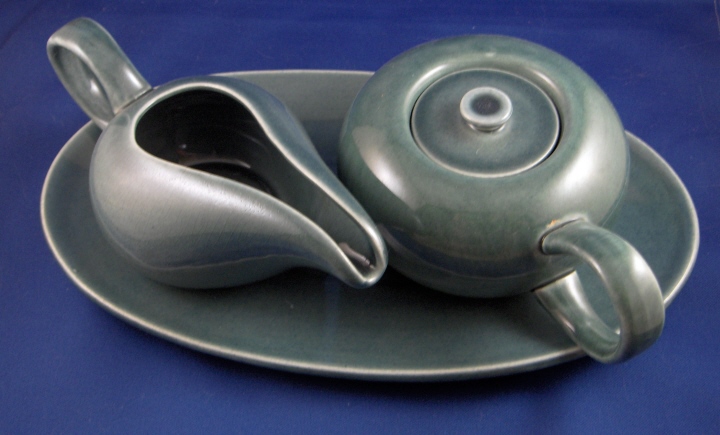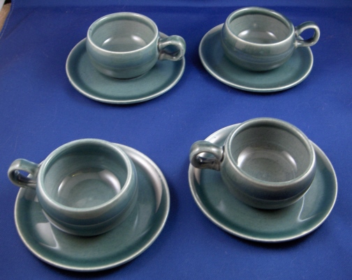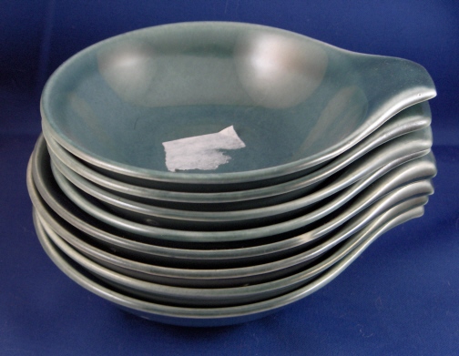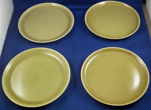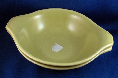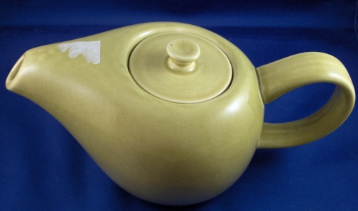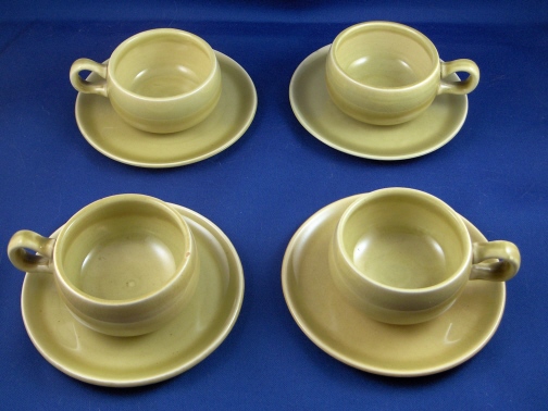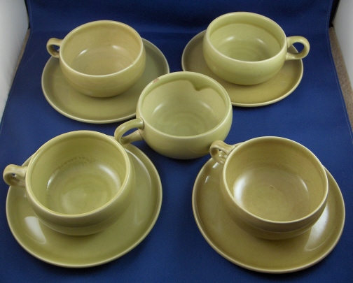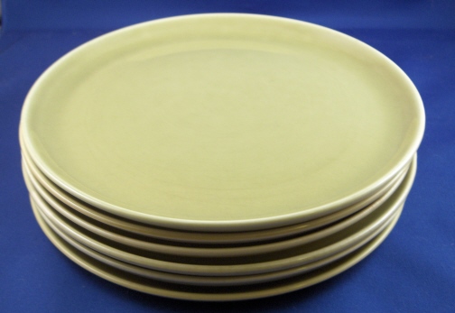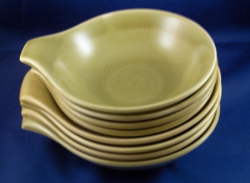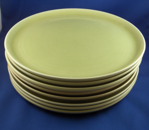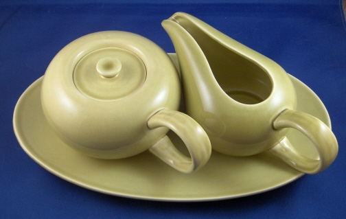 This is a really neat set of dishes designed by Russel Wright called the "American Modern" pattern (from 1939-1959). It was manufactured by Steubenville. An amazingly contemporary looking set for being over 50 years old. This set is part Chartreuse (Curry) in color and part Seafoam. These are the two more sought after colors for this set. I have quite a few pieces including a lot of the serving dishes, dinner plates, and the demitasse pieces. Took pictures of all of them so if you are interested just send me a note and I can detail sizes and condition (which is amazingly good for a set this old and fragile). I would also part with pieces of this set if you really need just one or two but only for the right price. I'd rather sell it as a whole and keep it together. Set is marked as shown in the picture but not all pieces are which seems to be the norm. Please email me for more information or other pictures.