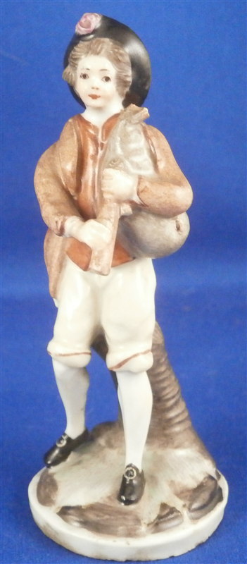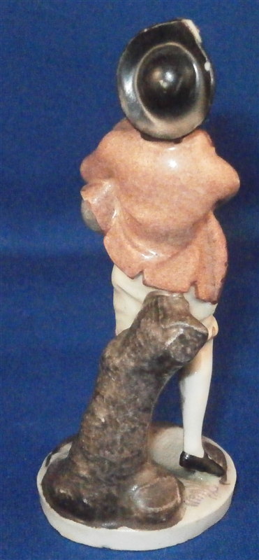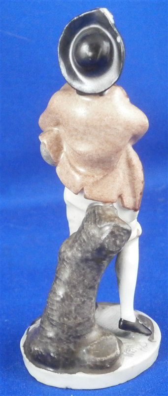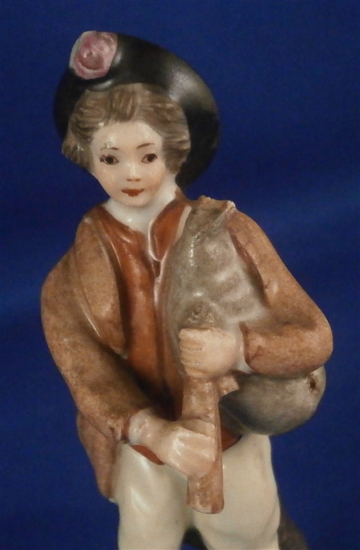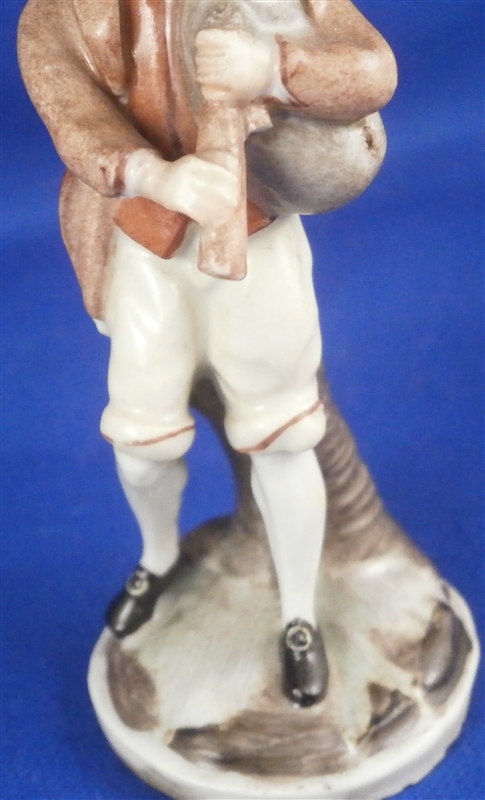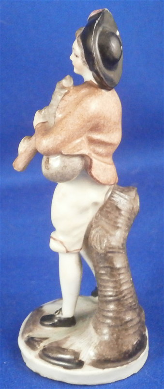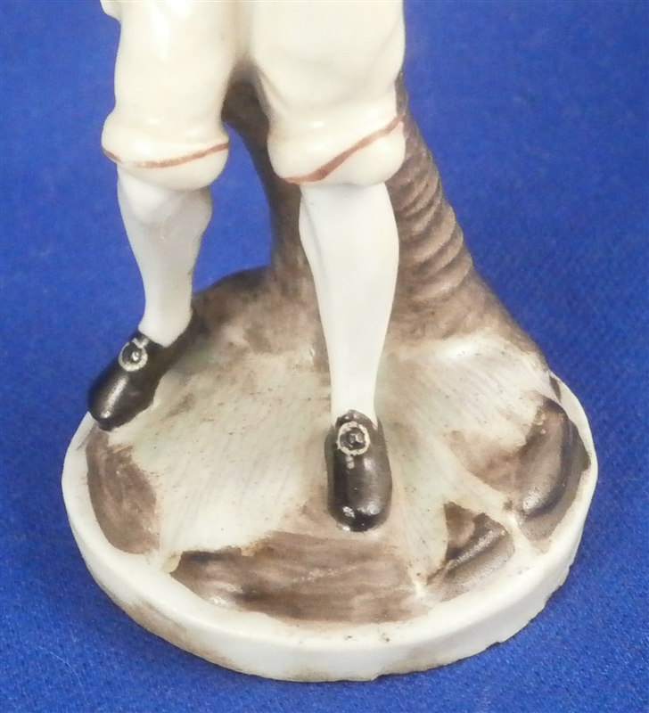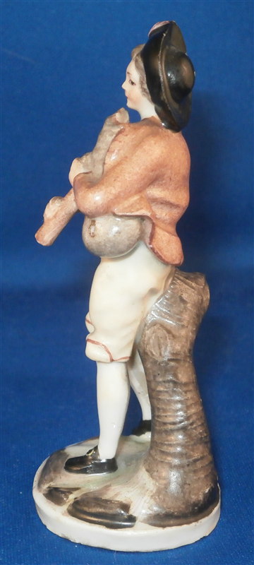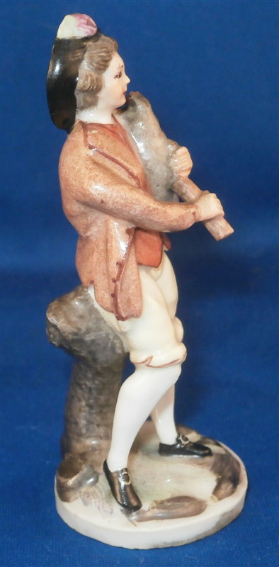 This is a rare miniature figurine made in Zürich about 1770. Likely from the Cris de Paris series, this bagpipe player is superbly modeled and hand painted. A fun piece with a typical base and a look similar to Ludwigsburg pieces but distintly Zurich. The factory at Kilchberg Schooren near Zurich was founded in 1763 and made softpaste porcelain which had a creamy white appearance at first but in 1765 they already started making hard paste porcelain mostly. The piece is in great condition with the top part of the instrument chipped off, a tiny chip to the hat rim and a worn spot on the hat. Glaze missing around the base edge and some tiny chips but that is from the making! All in all in superb shape! The figure is 3.5 inches tall and the base has a diameter of 1.375 inches. It is marked underneath with a faint Z mark in blue as well as their usual impressed marks as shown. Please email me for more information or other pictures.