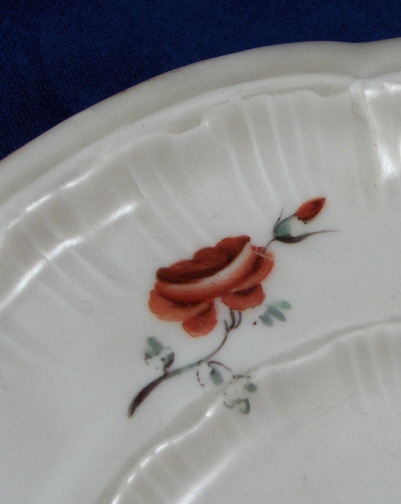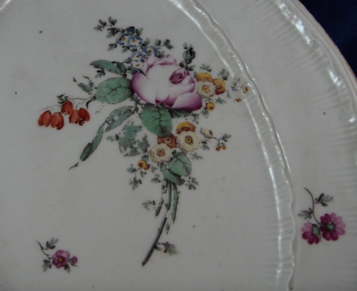 This is a serving dish or small platter made by Zürich in the 18th century. It is nicely handpainted with large floral arrangement as well as lots of smaller flowers scattered throughout. Nice relief pattern to the rim and a gold trim to the edge. The piece is in good condition with some paint that has flaked off, the gold trim is worn and the footring has some chipping. It still displays very nicely and is a great and rare example of a top maker. The platter is marked underneath with the underglaze blue Z with two dots as well as incised N2 and HoL (not sure on that one!). The piece is 1 inch tall, 10.25 inches wide and 7.75 inches deep. Please email me for more information or other pictures.