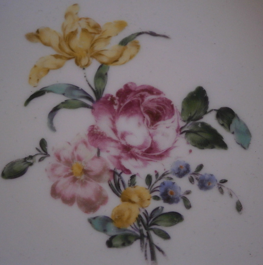 This is a saucer made by Zürich in the 18th century. It is nicely hand painted with large floral arrangement as well as three smaller single flowers along the rim. The piece is in good condition with a little wear to the flowers in the center and a chip to the foot ring. Marked underneath with the underglaze blue Z and an incised line in the center. The saucer is 1 inch tall and 4.875 inches in diameter. Please email me for more information or other pictures.