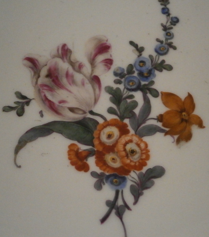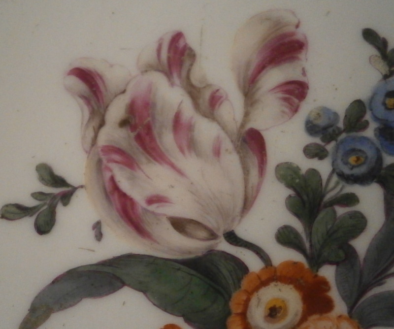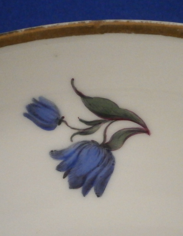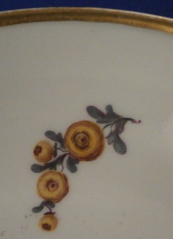 This is a really nice saucer made by Zürich in the 18th century. It is superbly hand painted with large floral arrangement as well as two smaller flowers and some tiny leaves to cover up some flaws and has a gold trim along the edge. The flwoers are the nicest I have seen by them especially that tulip! The saucer is in great condition with a bit of wear as shown. It is marked underneath with the under glaze blue Z.. as well as an incised number. The saucer is 1.375 inches tall and 5.25 inches in diameter. Please email me for more information or other pictures.
