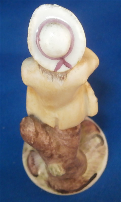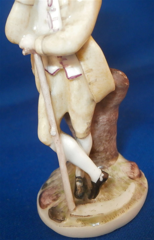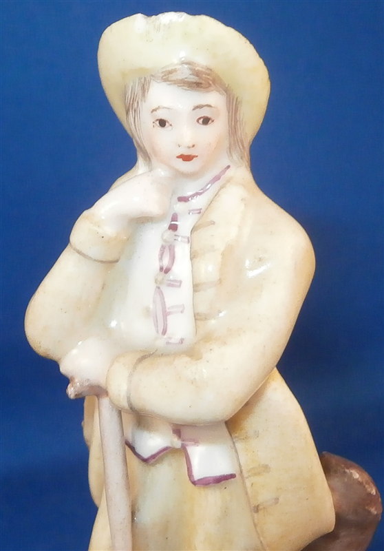 This is a rare miniature figurine made in Zürich about 1770. It is of a farmer leanign on his scythe after a round of hard labor to rest a bit. He is superbly modeled and hand painted. A fun piece with a typical base and a look similar to Ludwigsburg pieces but distintly Zurich. The factory at Kilchberg Schooren near Zurich was founded in 1763 and made softpaste porcelain which had a creamy white appearance at first but in 1765 they already started making hard paste porcelain mostly. The piece is in great condition with the handle of the scythe missing and some nibbles to the tip of the hat and some flaking of the black paint to one of his shoes but otherwise perfect. The figure is 3.25 inches tall and the base has a diameter of 1.375 inches. It is marked underneath with a faint Z mark in blue as well as their usual impressed/ incised marks as shown. Please email me for more information or other pictures. scythe